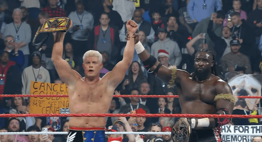 Rhodes busted his ear open after taking a closeline over the announce table. The match ended when Drew McIntyre interfered to attack Rhodes, but Oba Femi was not going to let that happen. The NXT champion stopped the beating and allowed Rhodes to get back up. Once dealt with, Rhodes and Femi raised each others hands.