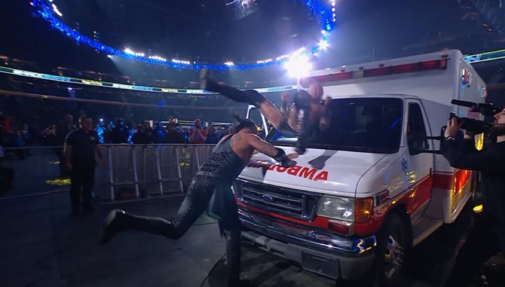 A chokeslam from the top of the ambulance through a series of tables was the best part of Priest versus Black. The former also mananged to shoot a fireball into the latter’s face, properly exacting revenge. Priest also nailed a Razor’s Edge through the ambulance windscreen – Black took a hell of a lot.