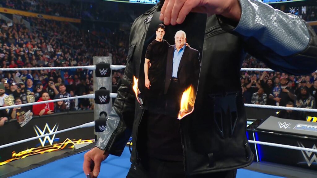 Drew McIntyre reveals the Three Stages of Hell. A regular wrestling match, then falls count anywhere, then a steel cage match. During his promo, he also reveals he went onto Cody’s bus and got a picture of his father. He proceeded to smash that photo and then burn it, all in an attempt to get Cody to punch him and lose his WWE title.